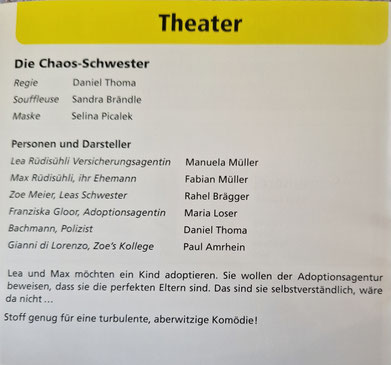 Präsident: Gilbert Müller/ Souffleuse: Sandra Brändle/ Maske: Selina Picalek/ Lea Rüdisühli: Manuela Müller/ Max Rüdisühli: Fabian Müller/ Franziska Gloor: Maria Loser/ Polizist Bachmann: Daniel Thoma/ Zoe Meier: Rahel Brägger/ Gianni di Lorenzo: Paul Amrhein
